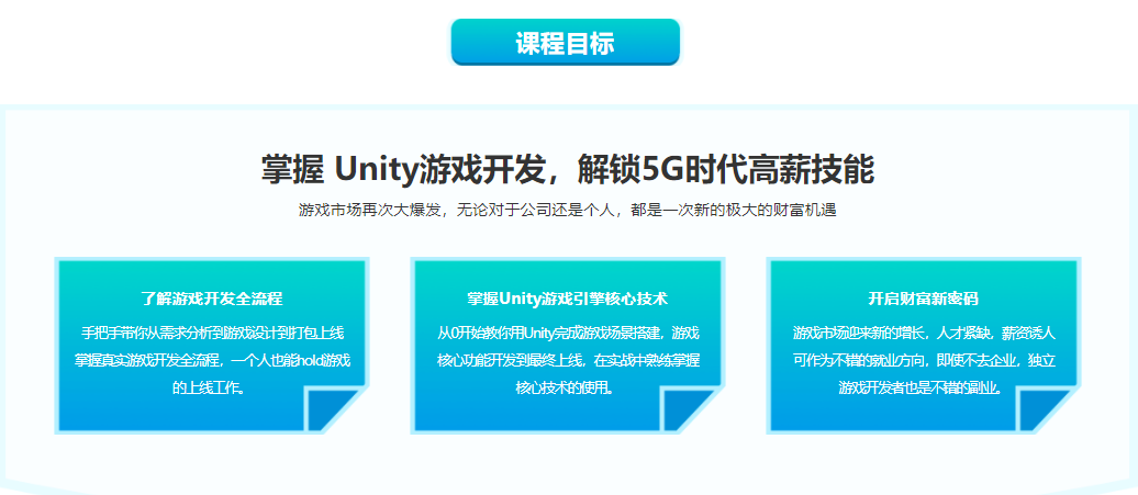 游戏市场再次掀起新的浪潮,人才紧缺,薪资诱人。Unity作为当下爆火的游戏开发引擎,非常适合对游戏开发感兴趣的人员入行!但Unity易上手难精通,本课程将带大家在项目实战中快速掌握游戏开发全流程,及Unity核心技术,最终拥有一款属于自己的线上游戏作品。