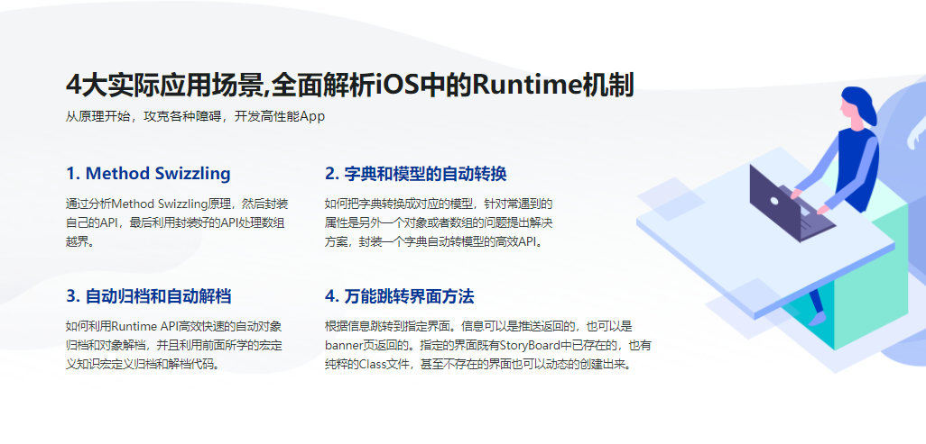 本章主要讲解Runtime在企业开发中的实际应用,包括Method Swizzling处理数组越界、字典和模型的自动转换、自动归档和自动解档、万能跳转界面方法。