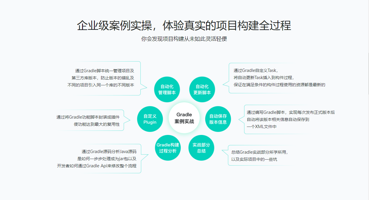 Gradle已全面运用于各大公司的 Android,Java等工程构建中,也是大型互联网公司面试的必考点。本课程将通过多个企业级实战案例,让你完整掌握Gradle,高效使用Gradle进行构建脚本的编写,解决构建过程中遇到的大部分难题。
