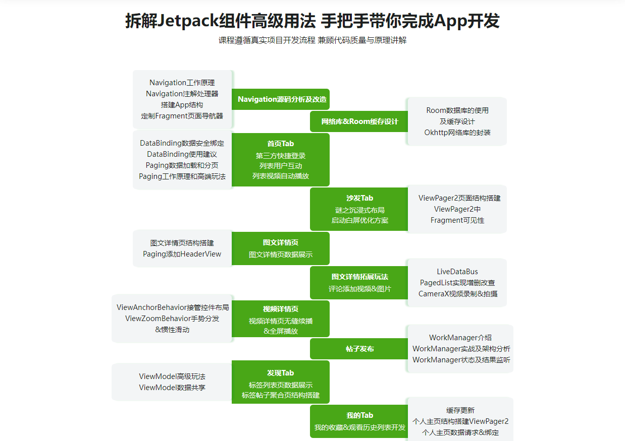 - 本章带你总体回顾Jetpack实战短视频课程,回顾我们使用的众多Jetpack组件特性,高级用法,避坑点,最后再展望与小伙伴们共建短视频服务端&客户端代码。