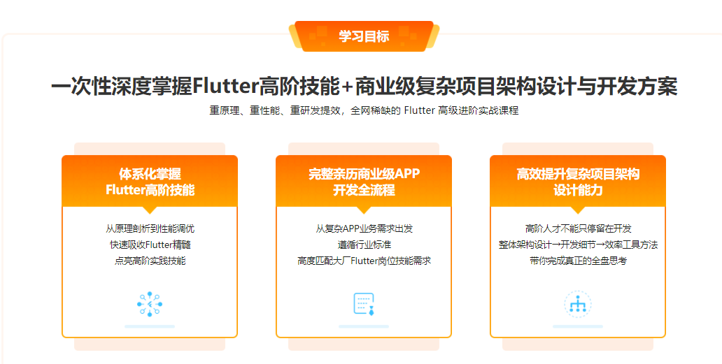 近年来各大公司对Flutter技能的要求越来越高,甚至设立了专门岗位,但掌握Flutter高阶技能的人才寥寥无几,市面上干货Flutter高阶课程少之又少,导致Flutter高阶人才缺口大。为此我们专门为大家设计了这门课程,助力你早日成为企业抢手的新一代工程师。