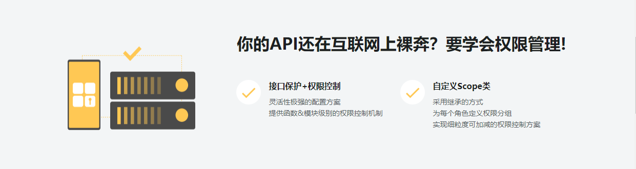 我看过太多同学编写的API在互联网上疯狂的裸奔了。殊不知这太危险了。API必须提供分层保护机制,根据不同用户的种类来限制其可以访问的API,从而保护接口。比如管理员可以访问哪些接口,普通用户可以访问哪些接口,小程序可以访问哪些,APP又能够访问哪些?灵活而强大的可配置Scope,可以帮助你事半功倍…