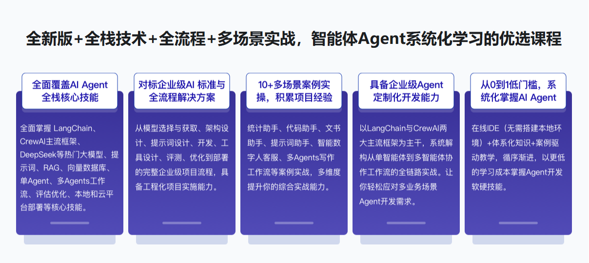 AI Agent 开发已是AI时代的关键技能,市场需求旺盛,人才紧缺。越早掌握,未来收益越大!本课从基础出发,手把手带你逐步深入,覆盖从需求分析到设计、开发、部署优化及评估的全流程。你将掌握全栈技能(LangChain、CrewAI、Deepseek、RAG、单/多Agent及工作流等)。积累10+多场景实战经验;具备智能化解决方案设计能力;全方位提升企业定制化、智能化开发综合实战能力,助力成为AI时代市场紧缺、枪手人才。