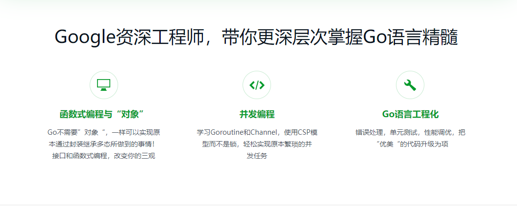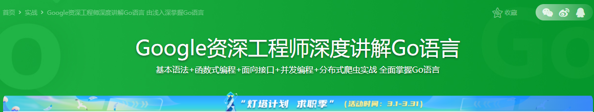 Go作为专门为并发和大数据设计的语言,在编程界越来越受欢迎!不论是c/c++,php,java,重构首选Go。本课程特邀谷歌资深工程师,从Go基本语法到函数式编程、并发编程,最后构建分布式爬虫系统,步步深入,带你快速掌握Go语言!