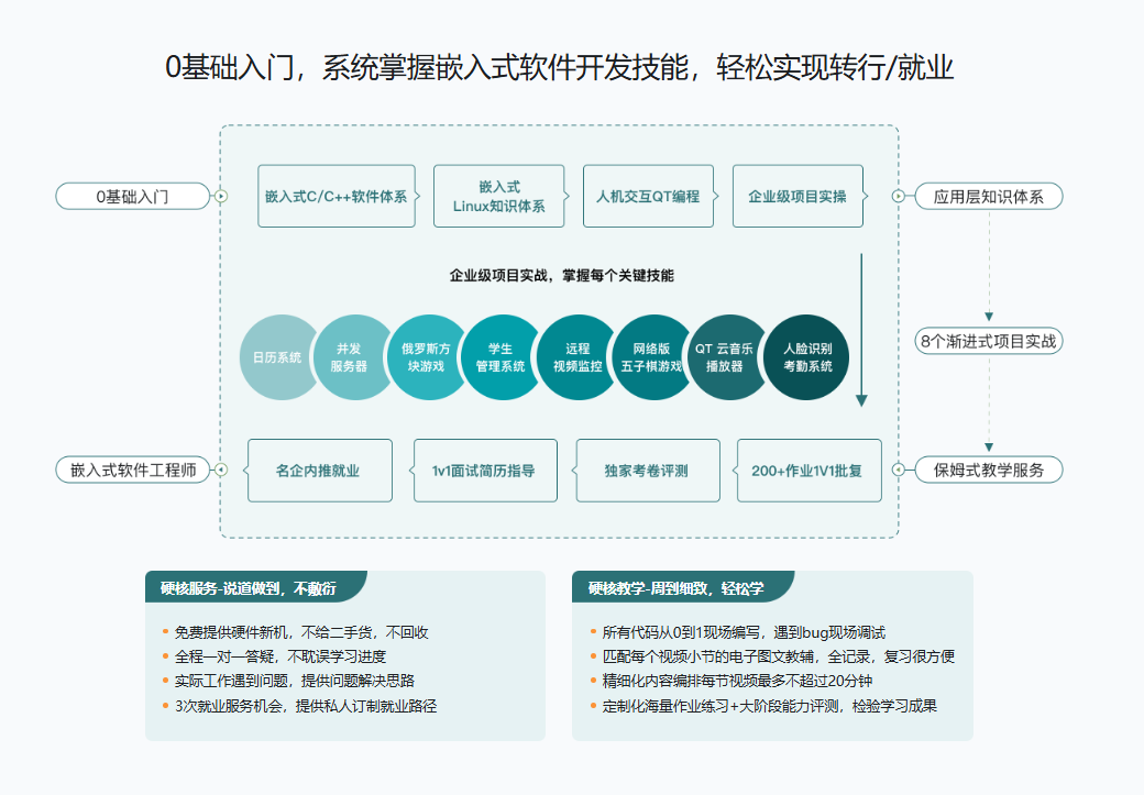 物联网/嵌入式软件工程师视频教程。本课程旨在为初学者提供一个全面的嵌入式软件开发学习路径。我们将从最基础的概念讲起,逐步深入到嵌入式软件的核心语法和开发实践。闯关式学习,高效构建完整技能体系,200+作业巩固练习,从易到难围绕8个实战项目,系统掌握嵌入式软件开发技能,轻松实现转行/就业。