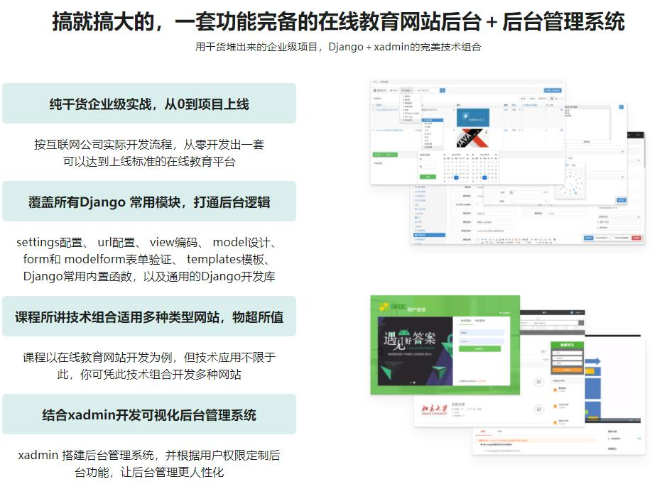 本课程完成一个Django的实战项目,以在线教育网站为案例,带你吃透Django的各个知识点,不同于其它课程的是,本课程采用Django+xadmin完成项目,这套技术组合,可助你解决大部分Python网站后端问题,解决企业的实际需求!
