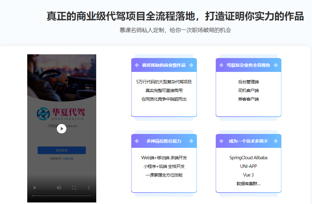 50000+代码,300+技术点,慕课网明星讲师为你私人订制工作1-3年的后端同学,面对晋升或者跳槽时经常被攻击的点是:技能点不熟练,大型项目生疏。很多人有苦说不出,公司平台没有机会,自己能怎么办?别慌!本课程就用一个商业级的多端全栈型代驾项目,带你补齐硬核经验,进军全栈开发,提升个人竞争力。