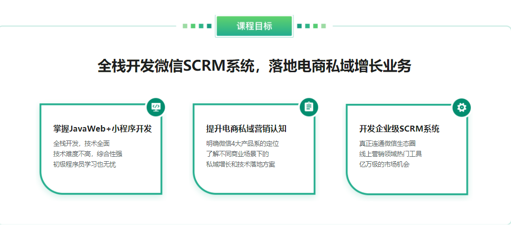 程序员想快速发展提升,除了编程技术精进,还有一大方向——深入业务,抓住好的赛道机会。当下各行业对于私域营销的迫切度与认可度居高不下,SCRM系统也受追捧。本课程带你自主开发一个打通个人微信、企业微信、公众号、小程序的SCRM系统,增强营销业务认知,提升商业场景技术落地实力。