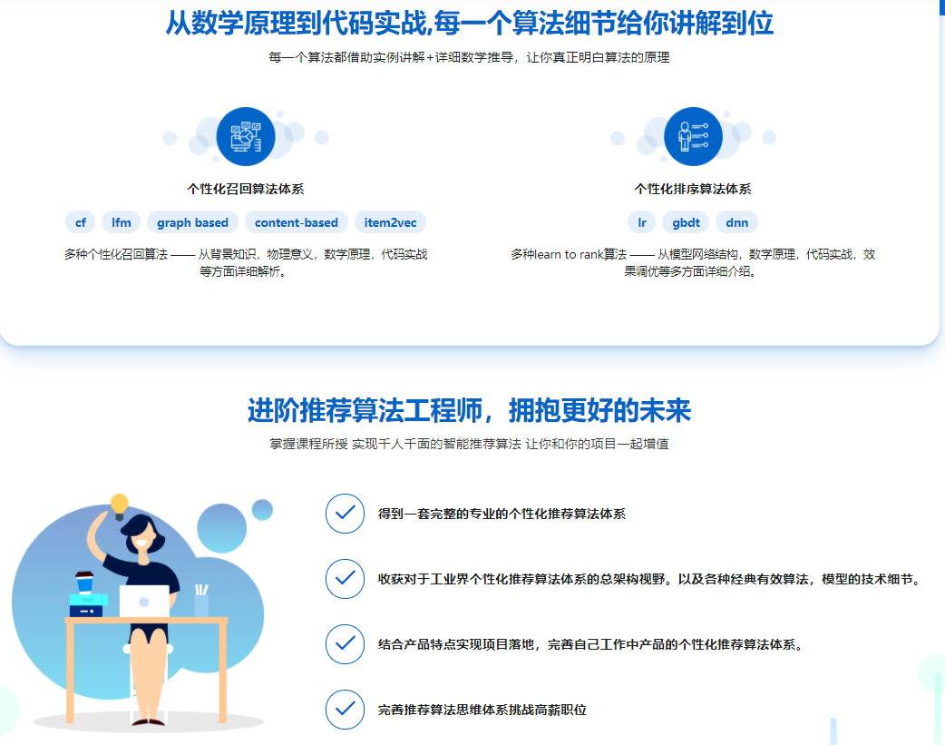 推荐算法工程师已成为各个大厂炙手可热的岗位,社招起步薪资20k+!本课程,讲师从算法原理到代码实战,细致的讲解个性化推荐算法如何在开发中落地,让你可以建立起自己的推荐算法体系。同时也可以让你掌握算法公式,模型参数迭代等技术的微小细节。