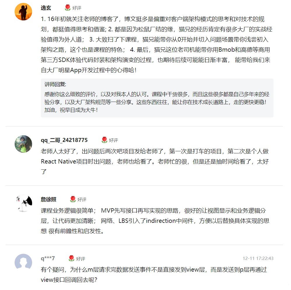 学员评价: 课程业务逻辑很简单; MVP先写接口再写实现的思路,很好的让视图显示和业务逻辑分层,让代码更加清晰; 网络、LBS引入了indirection中间件,方便以后替换具体实现的思想 很有前瞻性和启发性。
