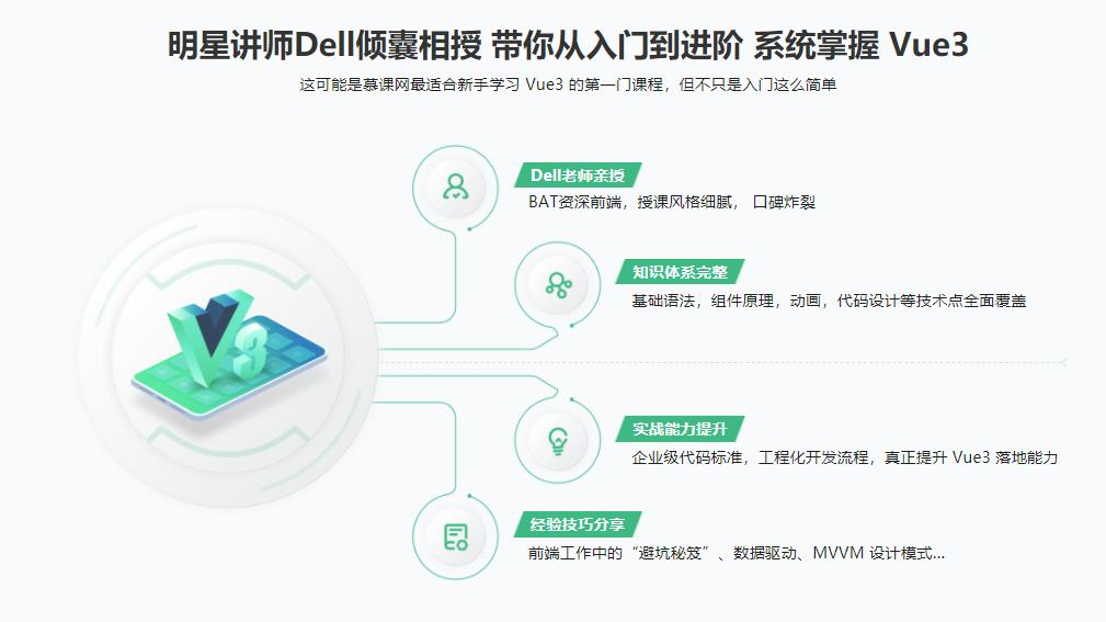 课程从 Vue3 基础语法,到组件原理、动画、代码设计,再到新语法扩展,全面系统地梳理 Vue 知识点。学习过程中,老师将倾囊相授多年的“避坑经验” ,带你以企业级代码质量和工程开发流程完成“京东到家”应用,实现对框架的彻底掌握。