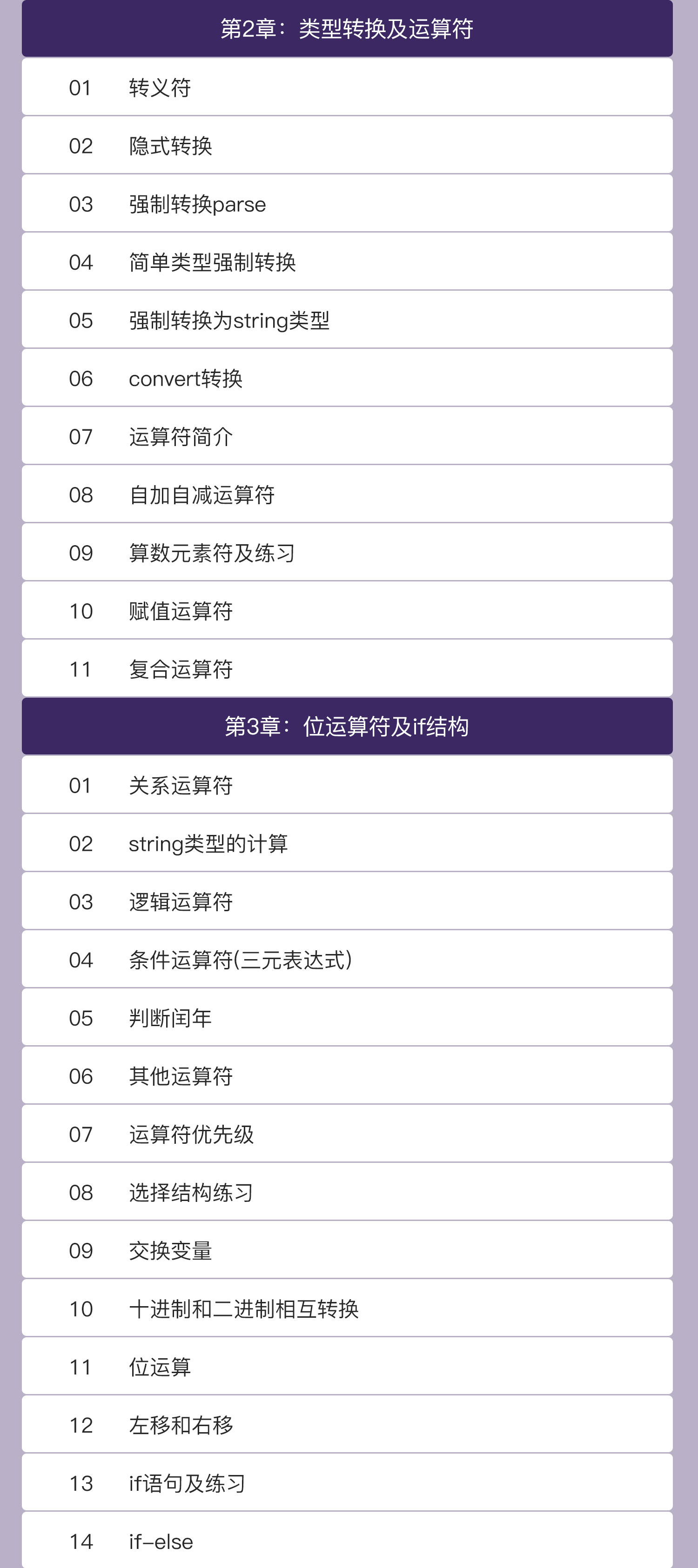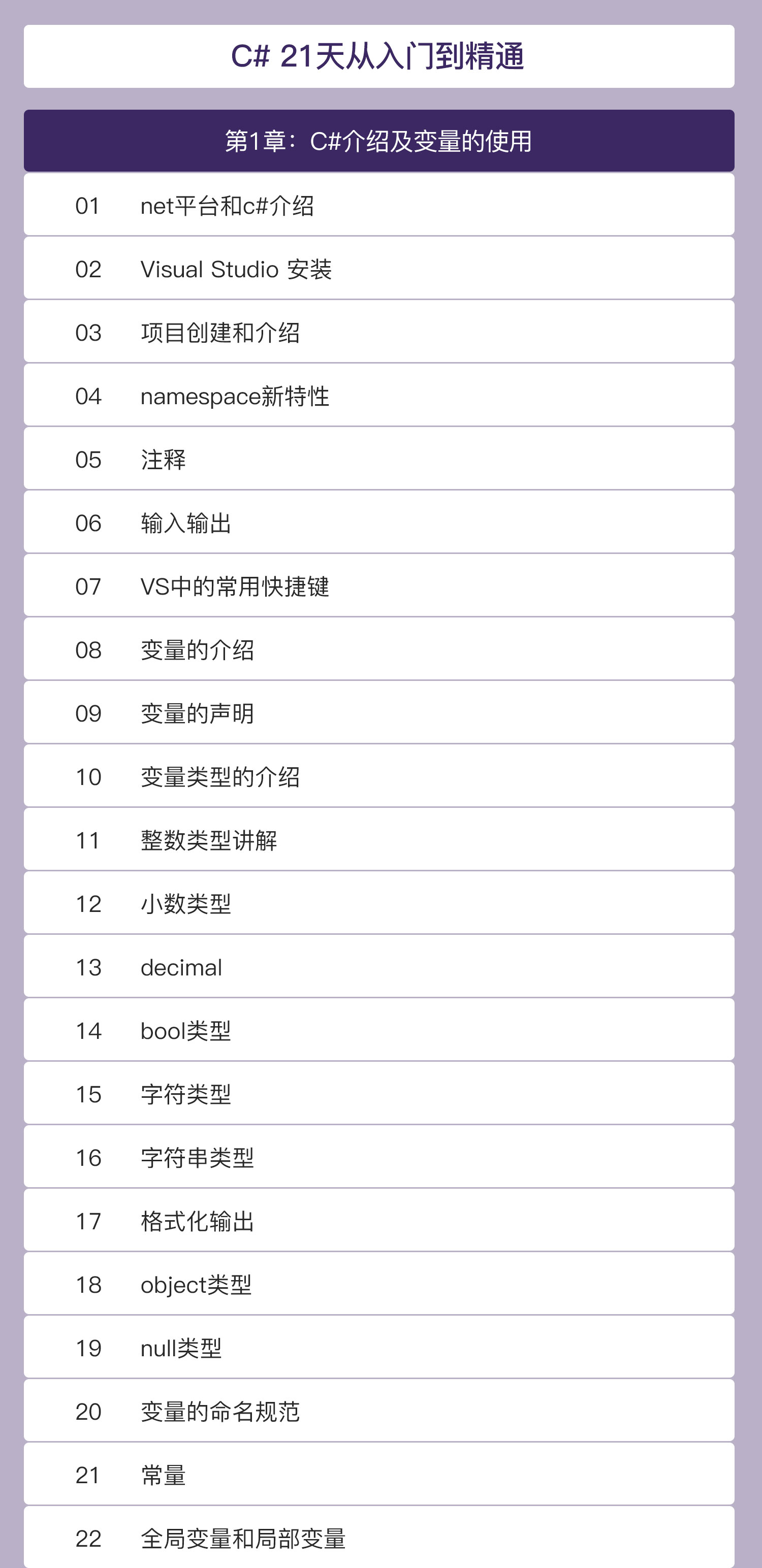 这是一门适合初学者的C#入门课程。通过易于理解的语言和丰富多彩的例子,详细介绍了使用C#开发Windows应用程序的技术。本课程共169节。从C#语言的基本知识入手,逐步介绍了C#语言的各个方面,包括变量、数据类型、控制句、数组、函数、类别、继承、接口、异常处理等