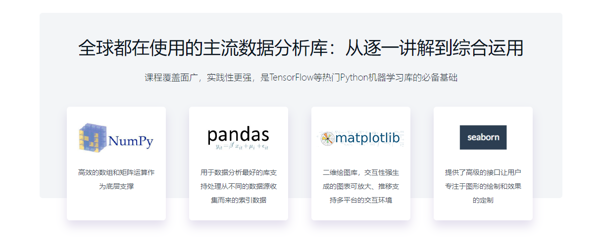 这是一个数据驱动的时代,本课程通过Numpy、Pandas进行数据科学计算,通过Seaborn、 Matplotlib进行数据图形化展示;从实战角度出发,让你在数据科学领域迈出重要的一步,开启Data Science职业之旅!