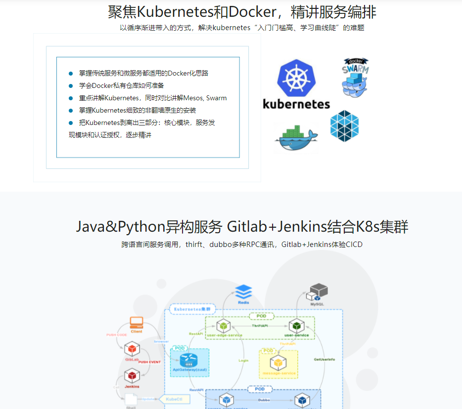 Kubernetes集群搭建/掌握微服务容器化要点/Thirft、Dubbo多种RPC通讯/跨语言微服务调用/Gitlab+Jenkins体验CICD