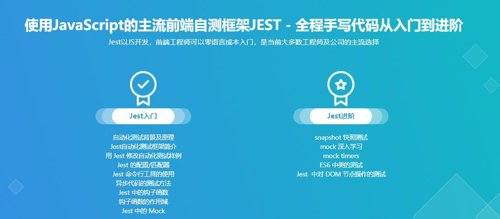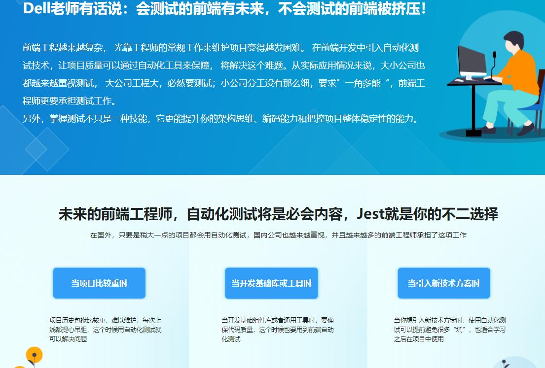 课程包括前端自动化测试框架 Jest 的讲解,React 中 Enzyme 组件测试工具的讲解,Vue-test-utils 的讲解,以及 TDD,BDD 测试模式的讲解,单元测试,集成测试的讲解。让你形成自己的测试方法论,提高核心竞争力。